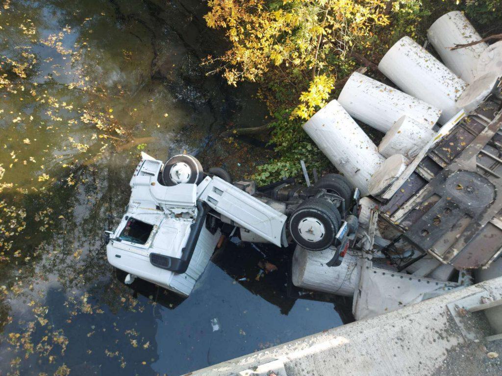 След падането в реката шофьорът е успял да излезе от кабината и няма сериозни наранявания. Движението в участъка не е затворено.