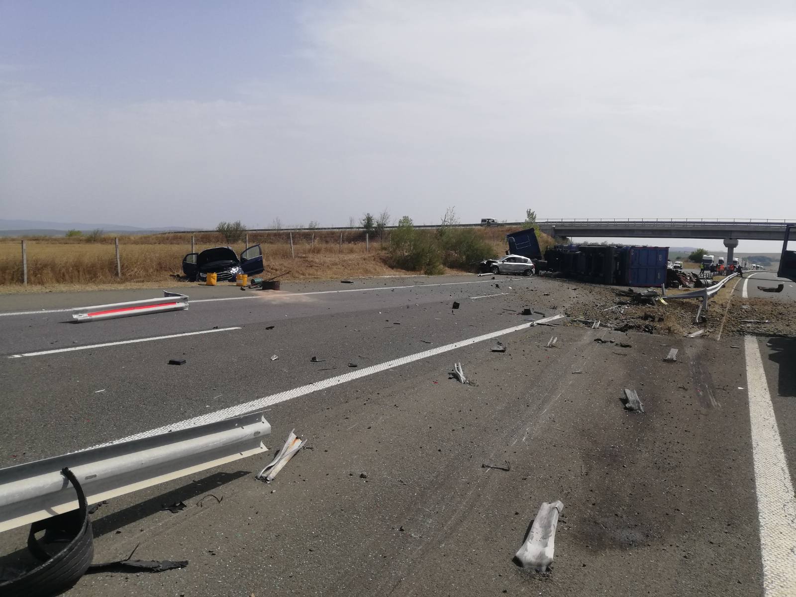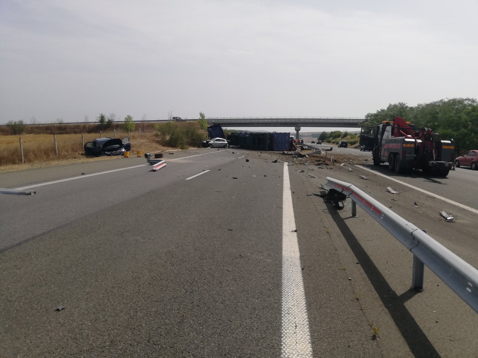 Инцидентът е станал около 09:23 часа днес, при който по време на движение се пука гума на товарен автомобил, превозващ скрап, пътуващ в посока Бургас. Водачът е загубил контрол и превозното средство е скъсало двете средни предпазни мантинели. Той е блъснал три леки автомобили, пътуващи в посока София, след които се преобръща напреки на пътното платно.