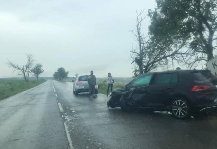 Виждат се два катастрофирали автомобила, единия от които е паднал към дерето вдясно от пътя, а другия е със смачкана предна лява половина.