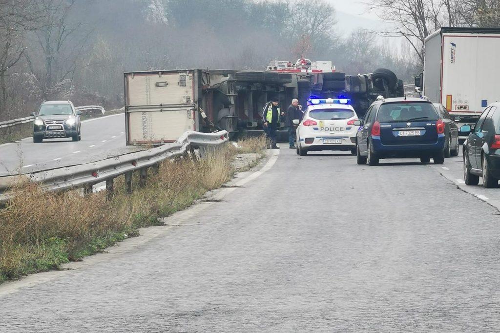 От снимките става ясно, че тирът се е забил в мантинелата, която прегражда платната в двете посоки. Той се е преобърнал наляво.