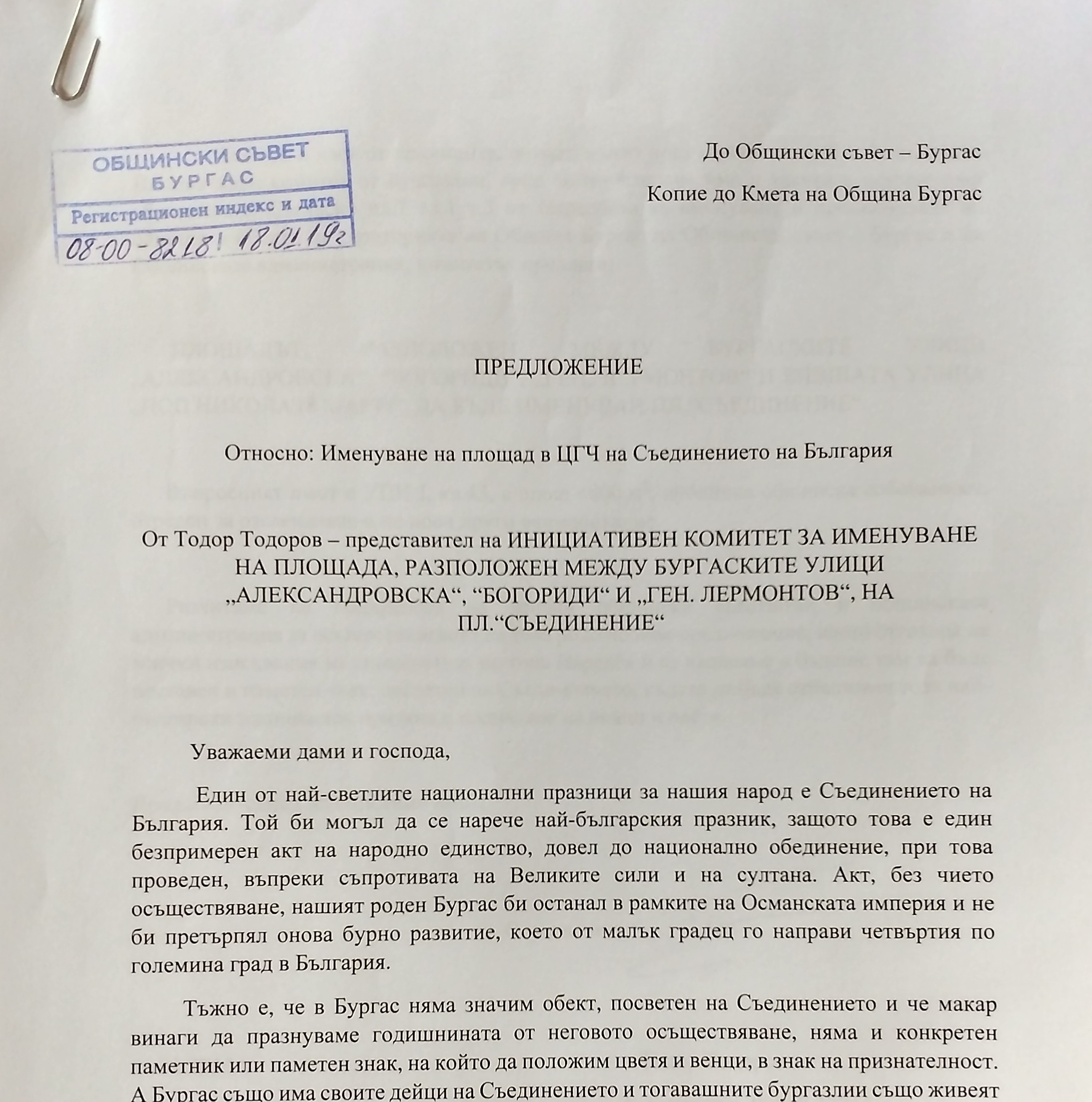 За обсъждането бяха входирани две предложения за име на площта. Първото е входирано в Общински съвет на 18 януари от инициативен комитет, който е български и носи името „Съединение“, а второто е входирано, след тази дата, от сдружение, което е еврейско или еврейско-българско. Тяхното предложение за име е „Толерантност“.