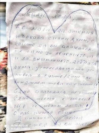 „Едва няколко реда, а толкова много топлина, кураж и сила. Признателността във вашите очи – нашите пациенти, е най-голямата награда за нас медиците! Това е двигателят, който ни кара да продължаваме да вървим смело напред, въпреки умората, трудностите, неизвестните и стихийността, с която тази пандемична година ни постави на първата линия!“