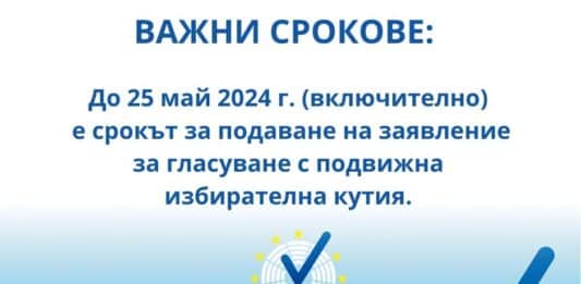 Централната избирателна комисия /ЦИК/ уведомява, че до 25 май избирателите с трайни увреждания, които не им позволяват да упражнят избирателното си право в изборното помещение, могат да подадат писмено искане (Приложение № 30-ЕП или Приложение № 31-НС от изборните книжа), за да бъдат вписани в избирателните списъци за гласуване с подвижна избирателна кутия. Заявлението се … Продължете с четенето на ЦИК съобщи, че изтича важен срок за избирателите