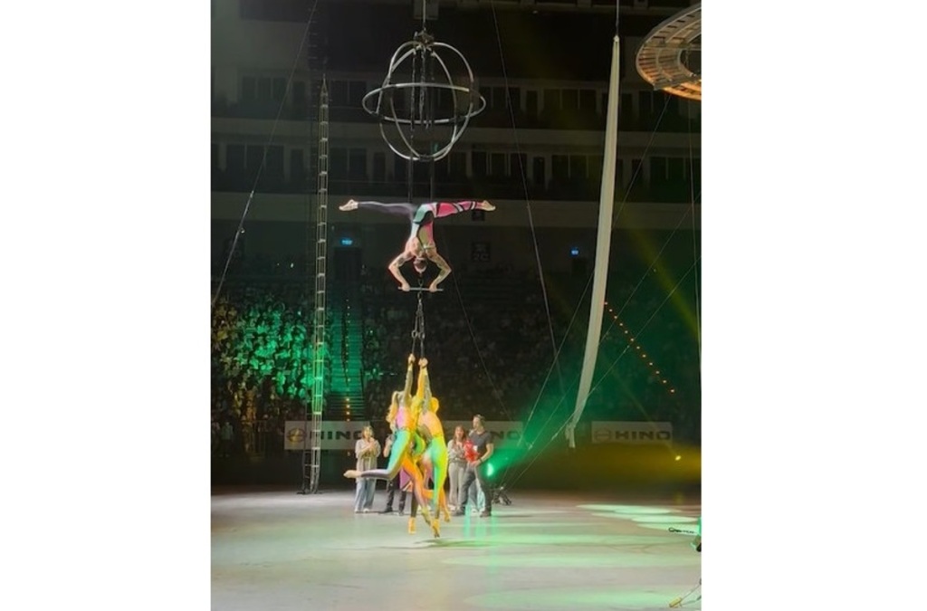 Докато се издига все по-високо и по-високо, трима от неговите колеги изпълнители – две жени и един мъж – биват повдигнати заедно с него. Не след дълго Майкъл сваля ръцете си от металния прът, за който се е вкопчил, така че изцяло да държи тежестта на трима души със зъби.