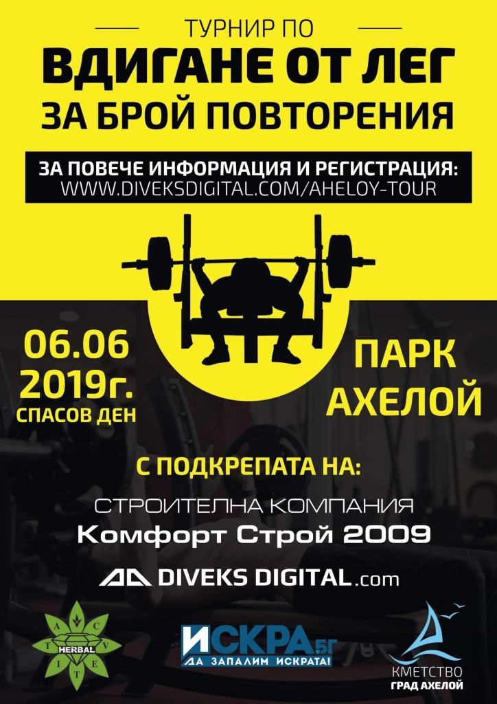 В град Ахелой /Община Поморие/ ще се проведе турнир по вдигане от лег за брой повторения. Организатор е СК „Ахелой“ с председател Атанас Широков.
