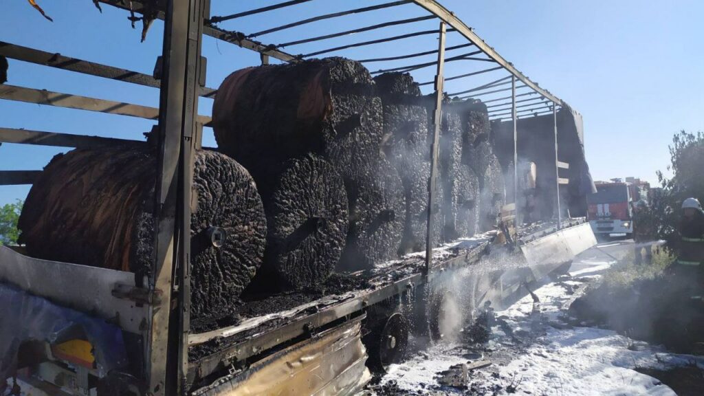 Злополуката е станала днес следобед. Камионът, натоварен с текстилни ролки, се е запалил по време на движение, но благодарение на съобразителната си реакция, водачът е успял да отдели ремаркето от влекача преди пожарните коли да пристигнат.