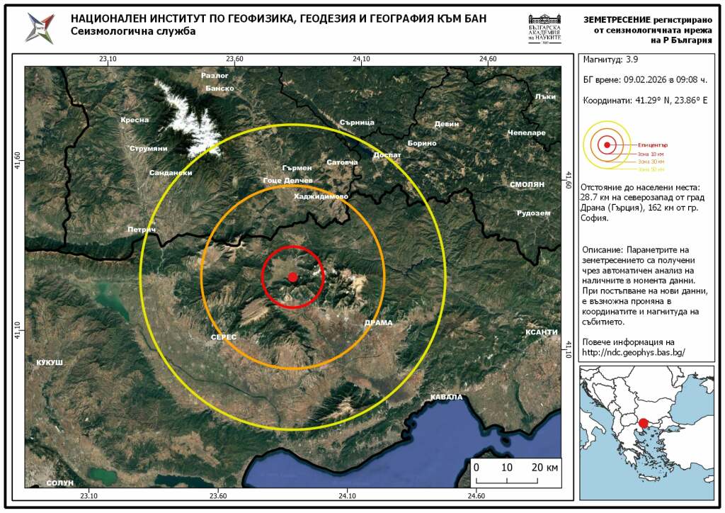 По данни на Националния сеизмологичен център към Национален институт по геофизика, геодезия и география – БАН, на 09 февруари 2026 г., в 09:08 ч., бе регистрирано земетресение с магнитуд 3.9 в района на село Зърнево (Κάτω Νευροκόπι), Гърция.