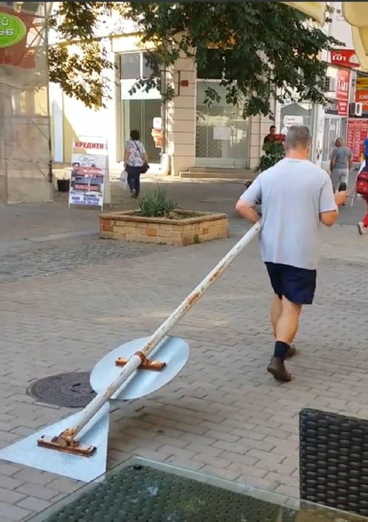 Установен е мъжът, който е влачил метална тръба с поставени на нея 2 пътни знака през централната русенска ул. „Александровска“. Случаят стана известен, след като беше заснет, а кадрите бяха публикувани и разпространени в интернет. От ОДМВР-Русе уточняват, че действието се е развило посред бял ден, но за съжаление, нито автора на клипа, нито някой от гражданите, станали свидетели не е подал сигнал на тел. 112 или в подразделение на полицията.