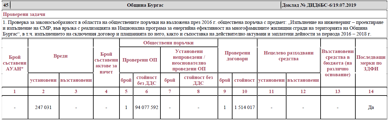 В уебсайта на „Агенция за държавна финансова инспекция“ /АДФИ/ е публикуван документ за приключили финансови инспекции през третото тримесечие на 2019 година. На страница 39 е показана част от доклад № ДИД6БС-6/19.07.2019, който се отнася за Община Бургас. В него е посочено, че има вреди на стойност 247 031 лева.