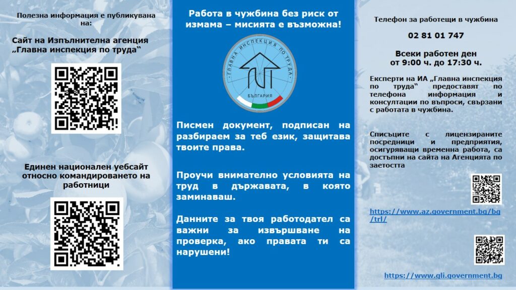 ИА ГИТ напомня на търсещите работа в чужбина, че трябва да тръгват с писмен документ с уговорени условия на труд и заплащане, включително работното време и полагаемия отпуск. Сигурен знак за измама е искането на различни такси за устройване на работа, каквито не трябва да се събират.