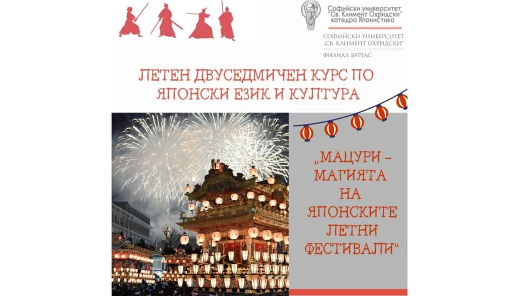 Филиал Бургас на Софийския университет „Свети Климент Охридски“ и Факултета по класически и нови филологии, Катедра „Японистика„, организират в морския град курс по японски език за ученици. Темата на тазгодишния двуседмичен курс е „Мацури – магията на японските летни фестивали“.