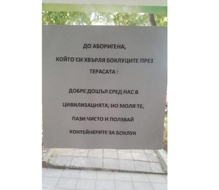 Тази бележка краси един от входовете на жилищен блок в бургаския комплекс „Славейков“. Журналист на Искра.бг успя да намери автора й и да разговаря с него. Юлияна Стоянова разказа, че под прозореца на апартамента й редовно има боклуци, изхвърлени от съседите й директно през прозореца. И по клоните на джанката зад блока висели торбички с отпадъци.