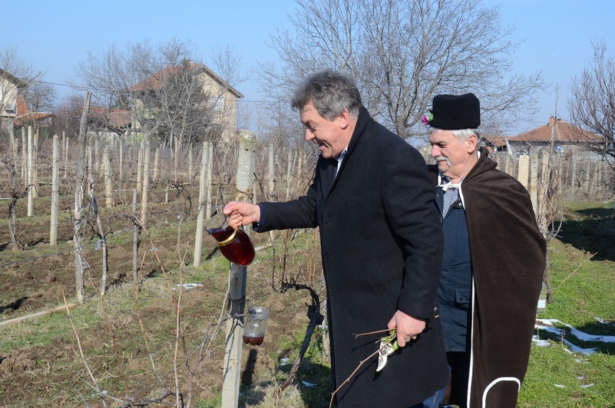 Редом със стопанина на къщата бе и Царят на лозето – Петьо Диков, който пръв отряза лозовите пръчки. Гостите също се включиха в ритуала, с пожелания за здрава и плодородна година.