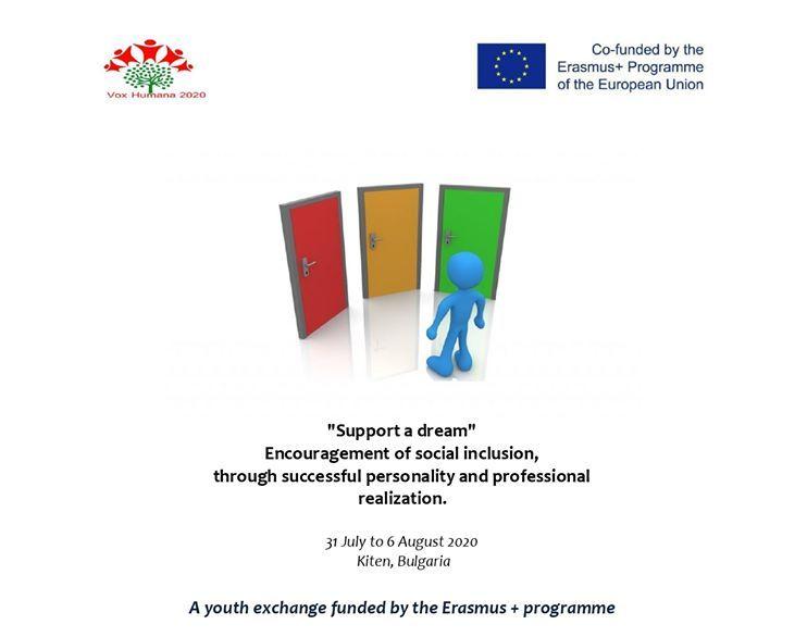 В Китен стартира проектът „Подкрепи една мечта – Насърчаване на социалното включване чрез успешна личностна и професионална реализация“. Той ще се реализира в периода 31 юли – 6 август. В проекта ще се включат сдружението „Вокс Хумана 2020“ – България и „Asociatia Tinerilor cu Initiativa Civica“ – Румъния. Той е финансиран от програмата „Еразъм+“ на Европейския съюз.