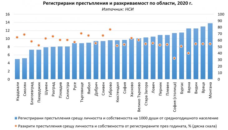 През последното десетилетие се забелязва стабилен спад на регистрираните престъпления срещу личността и собствеността в страната, разказват в свое проучване от Института по пазарна икономика /ИПИ/. Докато през 2010 г. техният брой е 17 на хиляда души от населението, през 2020 г. той спада до под 10. Разкриваемостта на престъпленията пък ясно се увеличава през последните няколко години и през 2020 г. надхвърля 52%.