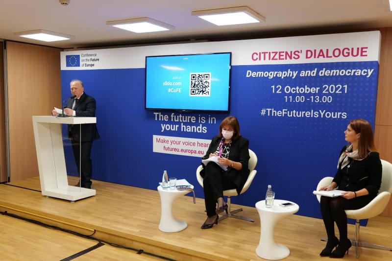 В рамките на събитието еврокомисарят по въпросите на демокрацията и демографията Дубравка Шуица подчерта, че за първи път сега ЕС отдели специално комисарски портфейл на темата демография. По думите й освен двата важни за Евросъюза прехода – зеленият и цифровият, преходът в демографията също има голямо значение за бъдещето на съюза. Тя представи и интерактивния инструмент за наблюдение и предвиждане на демографските промени в ЕС – „Демографски атлас“, достъпен на електронната платформа на Конференцията за бъдещето на Европа.
