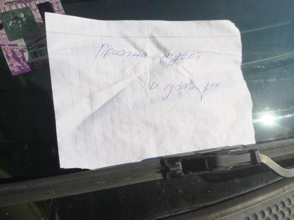 Десетки автомобили осъмнаха с ръчно написана бележка, в която се пожелава: „Приятна неделя и хубав ден“. Това се случи във Варна в ж.к. „Владислав Варненчик“ пред блок 21.