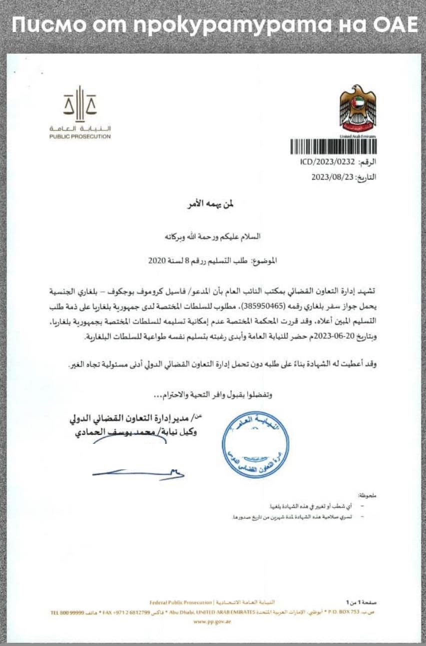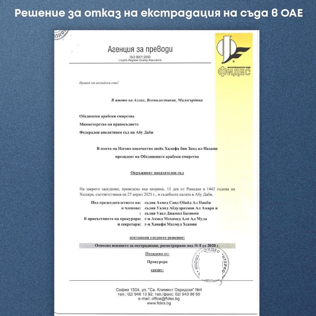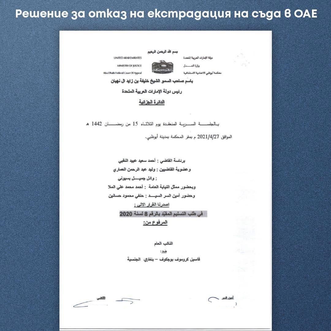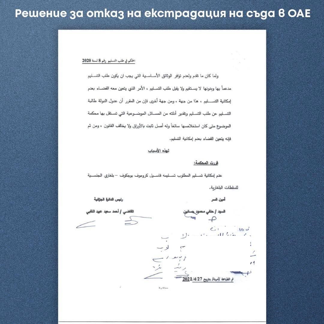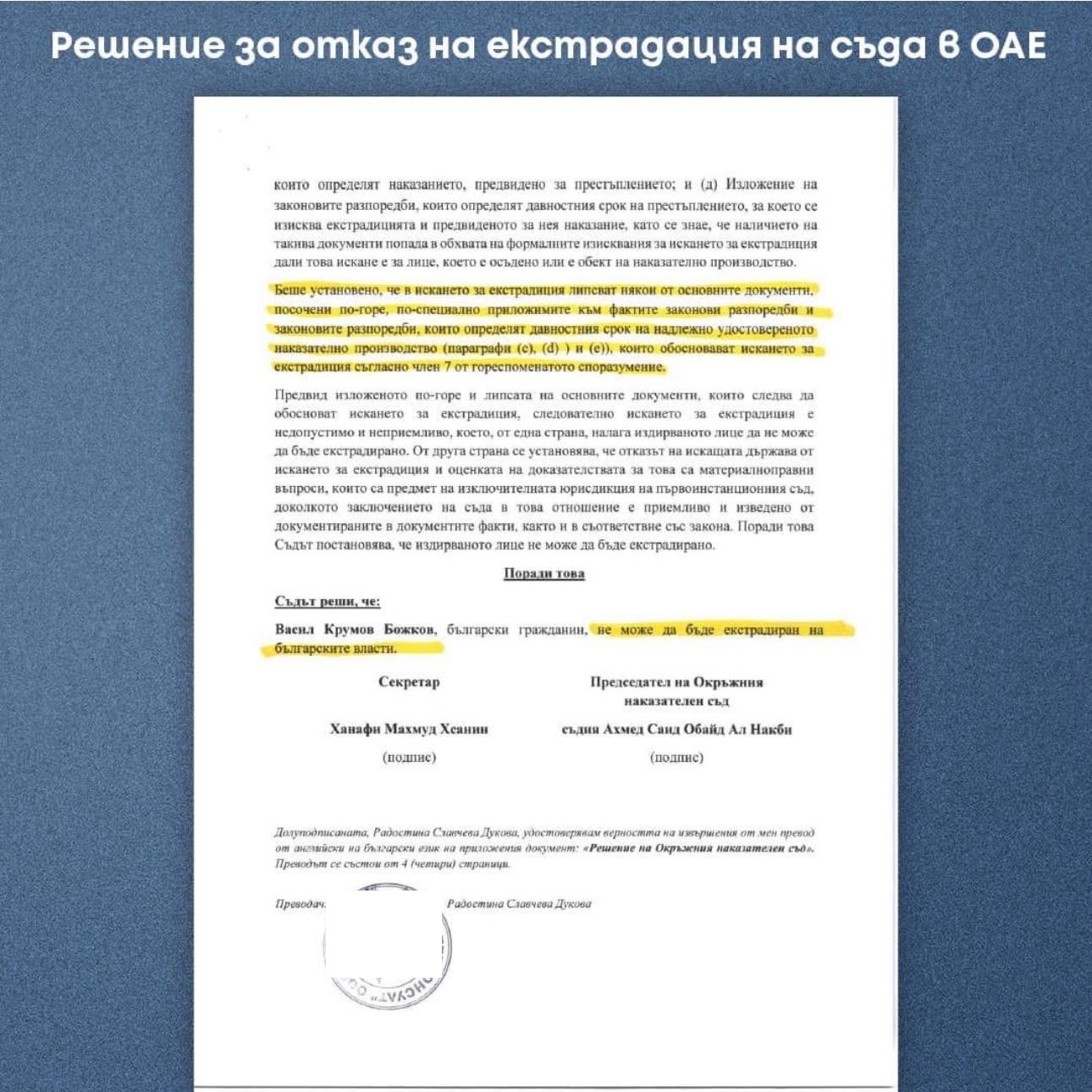 В коментара си Божков заявява: „Казвал съм и съм го доказвал много пъти, но ще повторя: През 2020 заминах за Дубай по работа, без никакви правни проблеми. Хунтата и прокуратурата направиха всичко възможно да ме задържат там. Прибрах се при първа възможност. Доброволно. Не съм екстрадиран. Няма решение за екстрадиция, има решение на съда на Емиратствата за отказ от екстрадиция.“