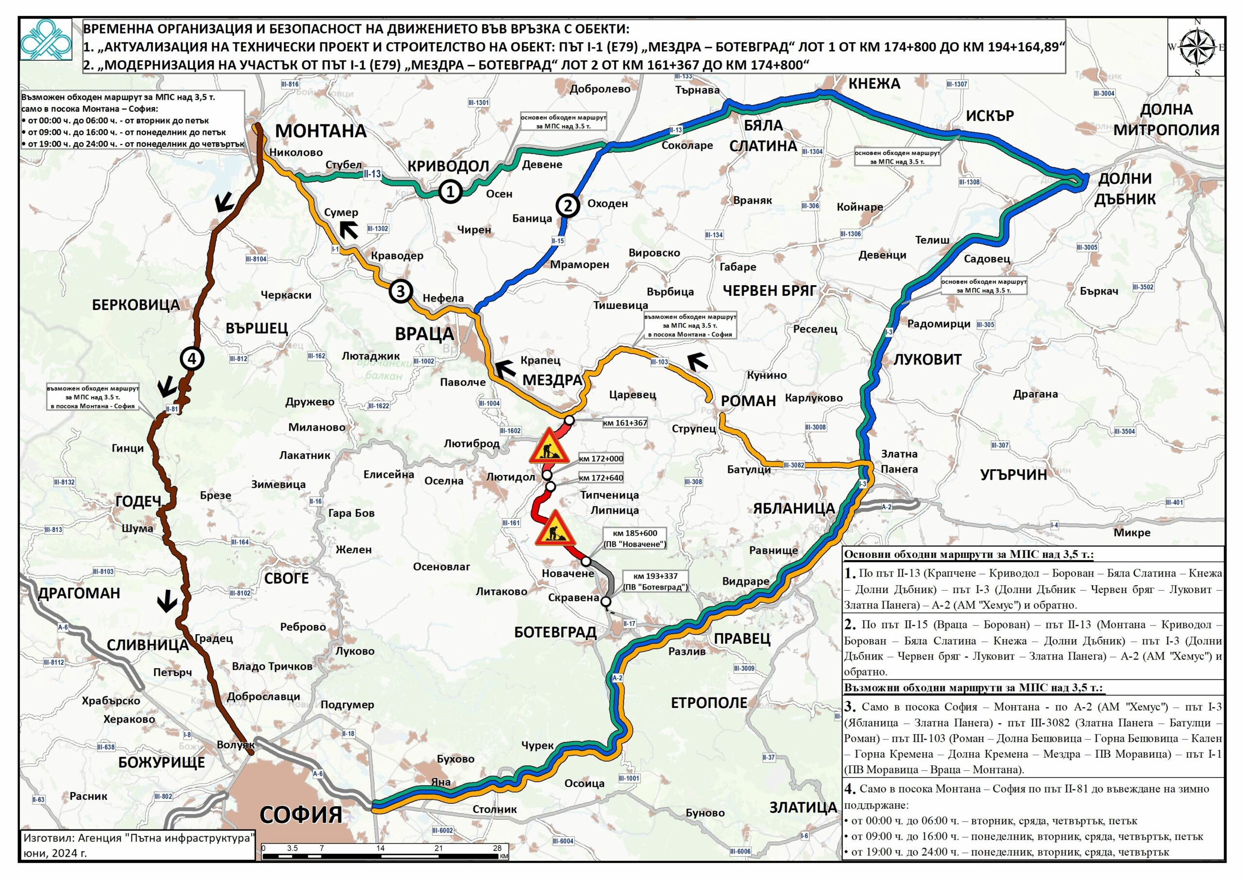 От 24 юни се ограничава движението на всички видове моторни превозни средства по отсечката Мездра – Лютидол – п. в. „Новачене“ на път I-1. Промяната в организацията на движение е необходимо за доизграждането на пътните възли на две нива – „Мездра“, „Дърманци“ и „Ребърково“ и модернизацията на пътя Мездра – Ботевград в участъка от 161-ви до 194-ти км.