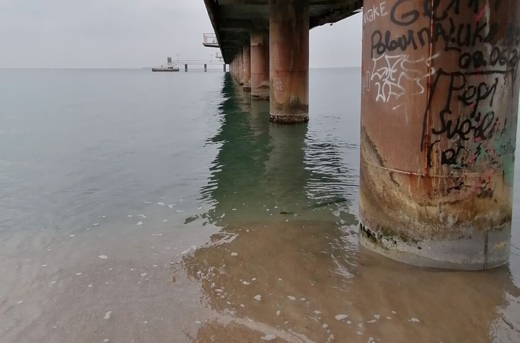 В момента тротинетката плува свободно под колоните на моста, в близост до брега.
