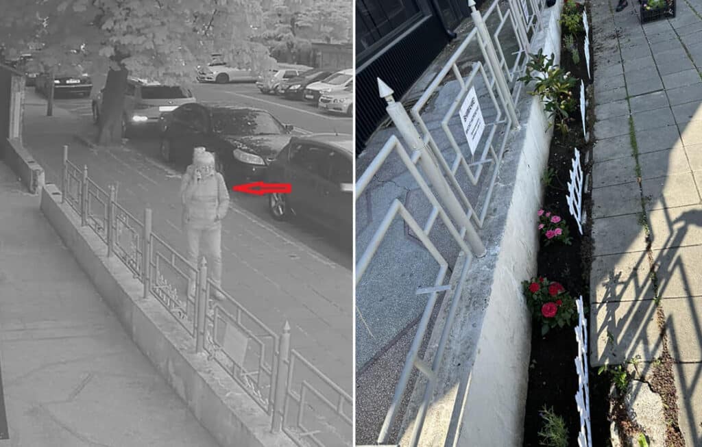 Подателката на сигнала съобщава, че набезите се извършват системно и са запечатани от три охранителни камери за видеонаблюдение. Вечер жената се дегизира, за да не бъде разпозната и не само краде цветята, но чупи оградите и нанася материални щети.