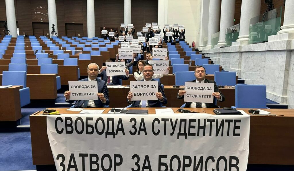 В пленарна зала народните представители от “Възраждане” вдигнаха лозунги “Свобода за студентите, затвор за Борисов!” в знак на протест срещу задържането на невинни граждани, които са заплашени да се превърнат в политически затворници на режима на Борисов.