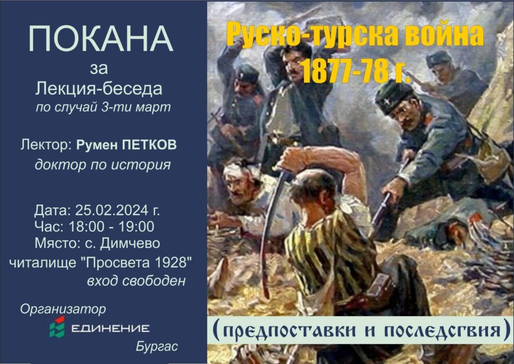 В навечерието на националния празник на България 3-ти март ПП „Единение“ призовава всички, които държат на историята и културата, да се присъединят към родолюбивата лекция-беседа. Събитието е посветено на Руско-турската война /1877-1878 г./ и нейното значение за българската нация. То ще се проведе на 25-ти февруари от 18:00 до 19:00 часа в читалище „Просвета 1928“ в село Димчево, Област Бургас.