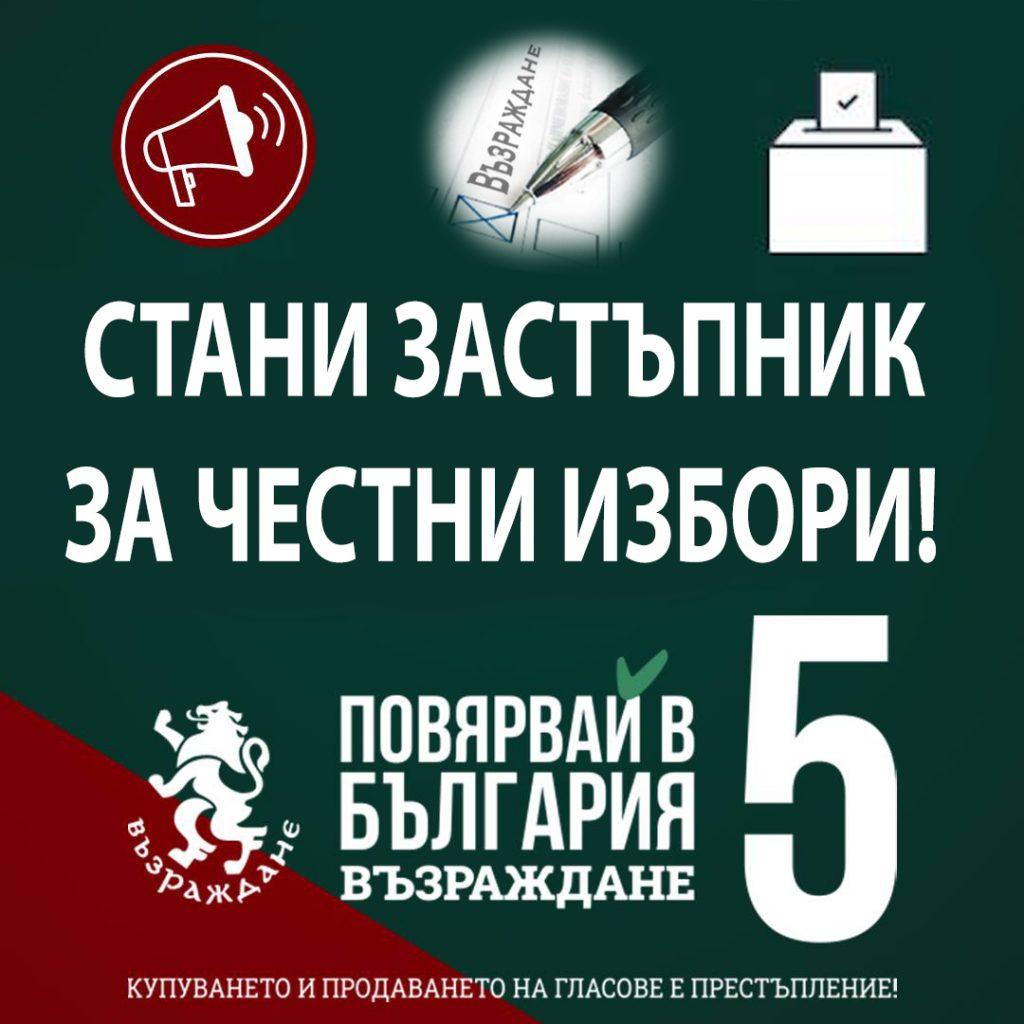 За трети поредни избори, от „Възраждане“ поставяме на вниманието на избирателя, честността и опазването на вота. Доброволните застъпници в изборния ден са единствената надежда за честни избори в България. Държавата ни е проядена от корупция и скандали, управляват ни безпринципни и лишени от морал хора, затова само чрез организираните действия на честните и достойни български граждани, можем да запазим обективността на вота в изборния ден.