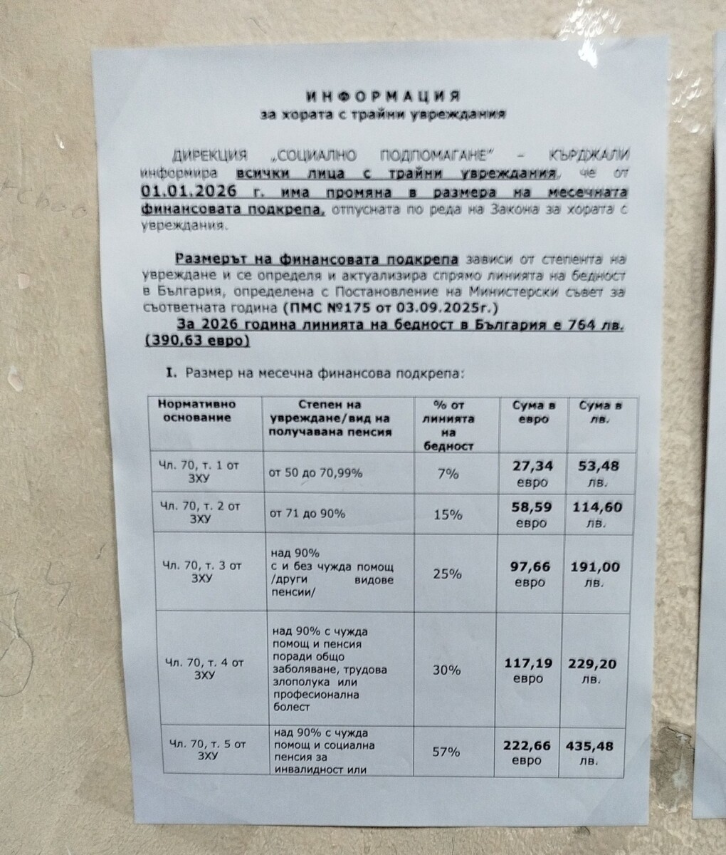 Увеличението на линията на бедност води до по-високи месечни помощи за хората с решения на ТЕЛК. Спрямо 2025 г. размерът на подкрепата нараства с около 19%, като конкретната сума зависи от степента на увреждане.