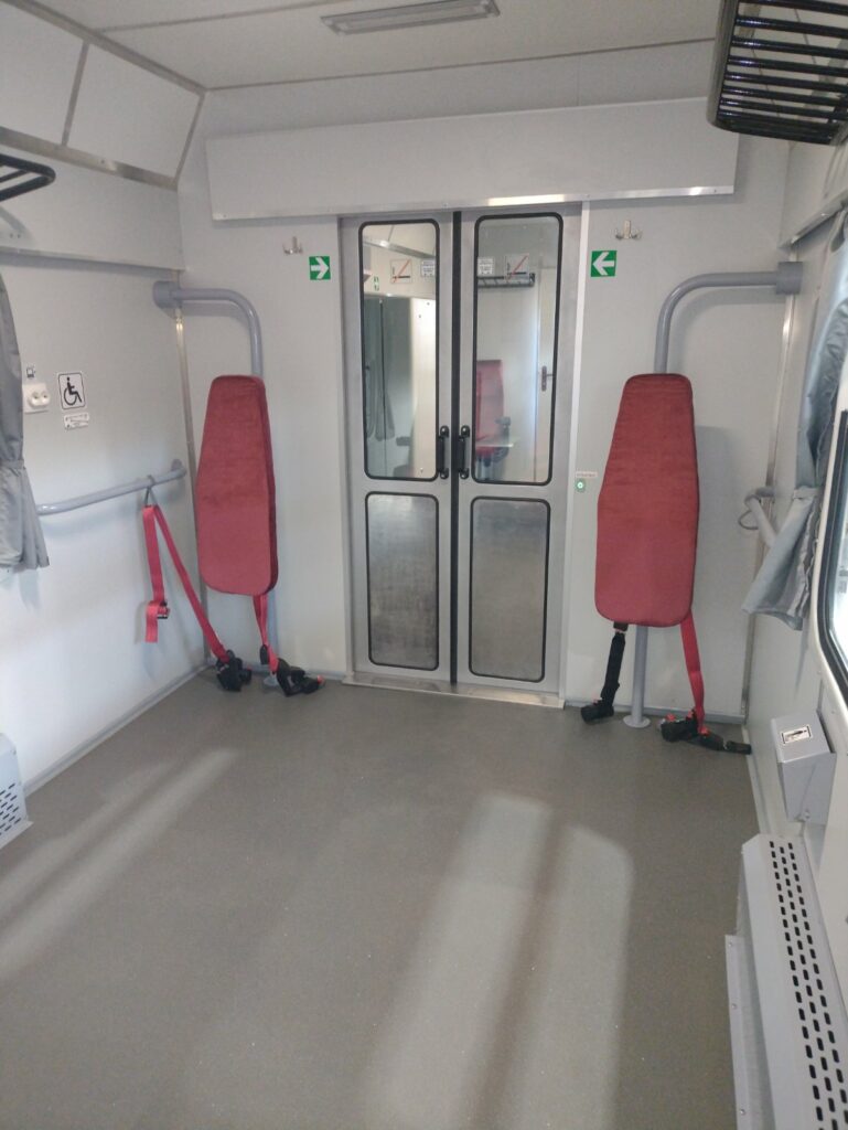 Във вагона са пригодени две места за лица с ограничена подвижност, две места за техните придружители и две места за допълнителен обслужващ персонал. Вагонът разполага с монтирани два броя лифтове от двете си страни с цел автономно автоматизирано качване и спускане на пътуващите. В специализирания вагон е изградено и специално санитарно помещение.