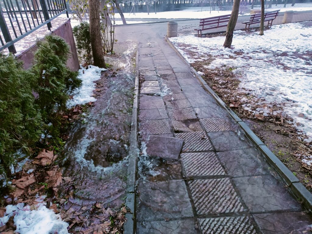 Видео от новообразуваната „река“ са се появили тази сутрин и във Facebook, където потребителите отбелязват, че е много опасна заради ниските температури и има възможност от заледяване. Паркът е под наклон, а преминаващите трябва да са внимателни.