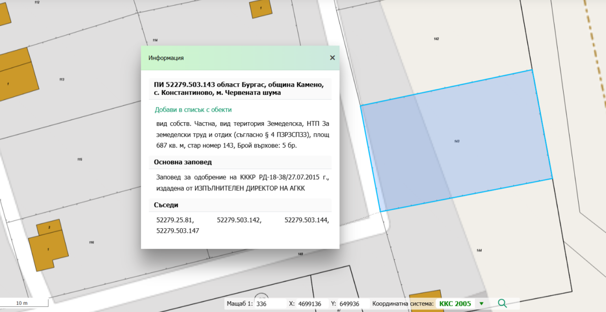 В подкрепа на твърденията си Ташев заявява, че разполага със снимки от кадастъра, на които ясно се вижда идентификаторът на имота без нанесено застрояване, както и с изображения, показващи постройка на същото място.
