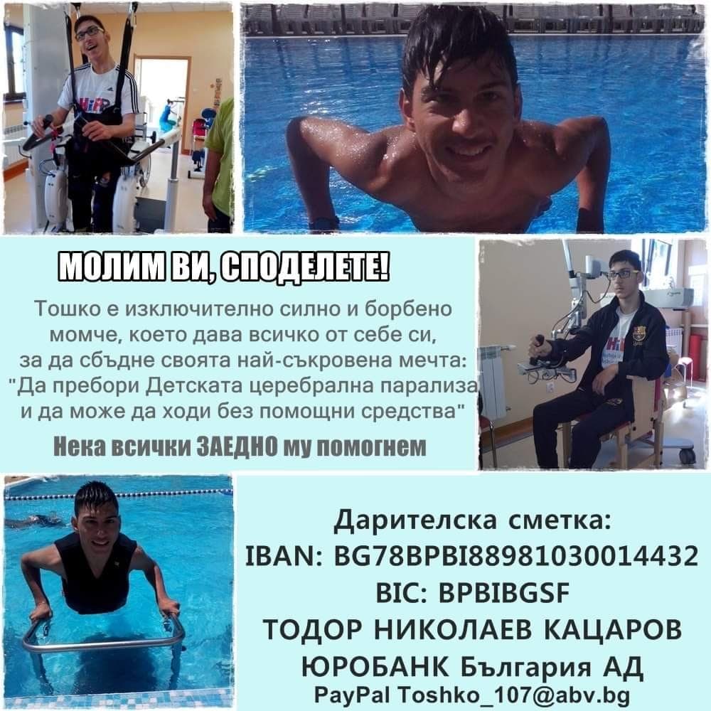 Тошко е на 22 години от град Бургас. Диагностициран е с Детска церебрална парализа /ДЦП/. Възпитаник на ППМГ „Академик Никола Обрешков“ гр. Бургас, той е изключително силно и борбено момче, което дава всичко от себе си, за да сбъдне своята най-съкровена мечта: да пребори болестта и да може да ходи без помощни средства.