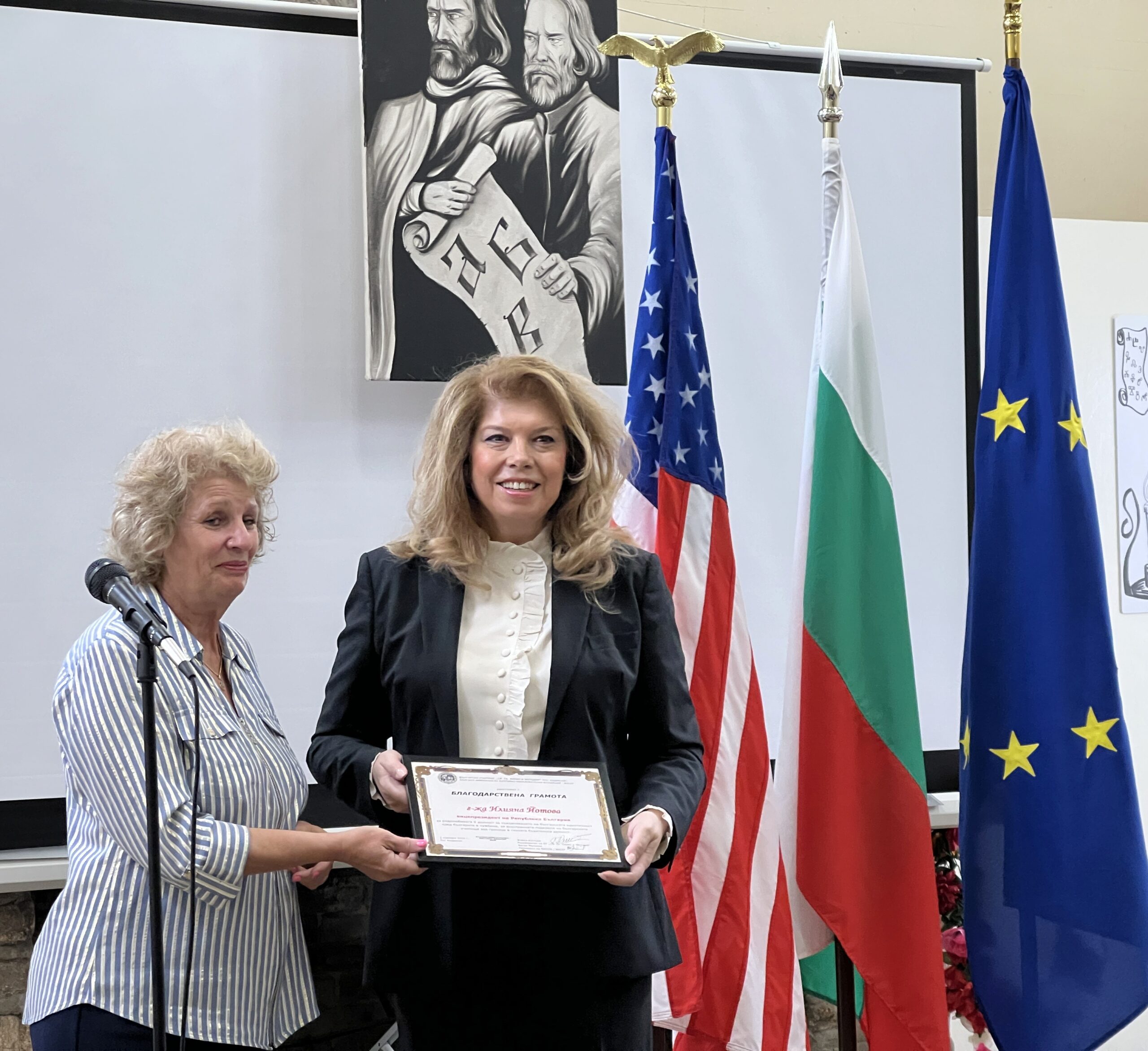За родолюбивата дейност за съхраняването на българската идентичност сред българите зад граница и всестранната подкрепа за българските училища зад граница Българското училище „Св. св. Кирил и Методий“ в Лос Анджелис удостои с грамота вицепрезидента Илияна Йотова. От своя страна, Йотова увери в подкрепата на президентската институция.