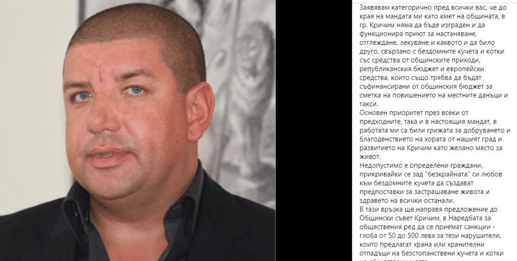 „Заявявам категорично пред всички вас, че до края на мандата ми като кмет на общината, в гр. Кричим няма да бъде изграден и да функционира приют за настаняване, отглеждане, лекуване и каквото и да било друго, свързано с бездомните кучета и котки със средства от общинските приходи, републиканския бюджет и европейски средства, които също трябва да бъдат съфинансирани от общинския бюджет за сметка на повишението на местните данъци и такси“, каза още Калчев.