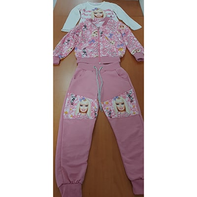 – Детски комплект от панталон, бяла блуза и розов суичър с цип, с надпис „Barbie“ и щампа на кукла – бранд Barbie и неизвестна страна на произход;