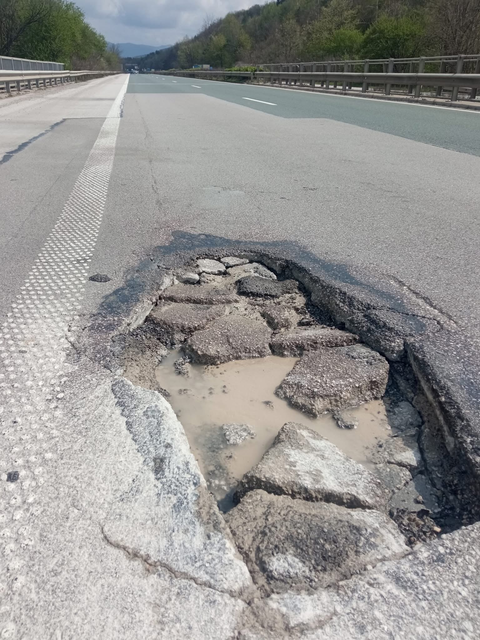„Автомагистрала „Хемус“ – път в „добро експлоатационно състояние“, според критериите на АПИ. Тази дупка вече веднъж е била „ремонтирана“, в момента дори не е обозначена, така, че бъдете внимателни – намира се на надлеза над разклона за гр. Ботевград в посока София.“