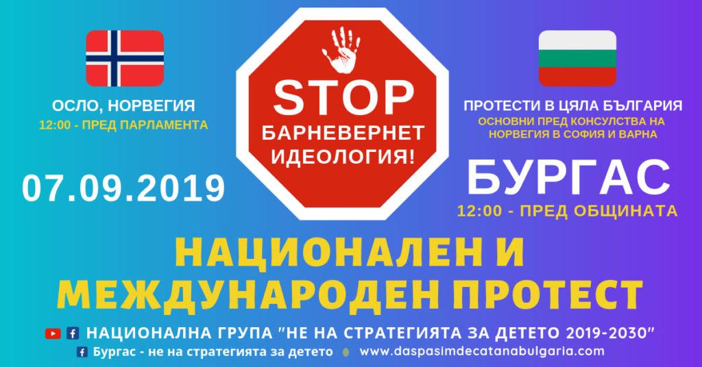 Не желаем чужди политики и се обявяваме против норвежкия социален модел! Организатор за Бургас е групата „Бургас – Не на стратегията за детето“ и призовава всички граждани и родители да дойдат, и да изразят своята подкрепа към тях, и против всички антидетски и антисемейни политики!
