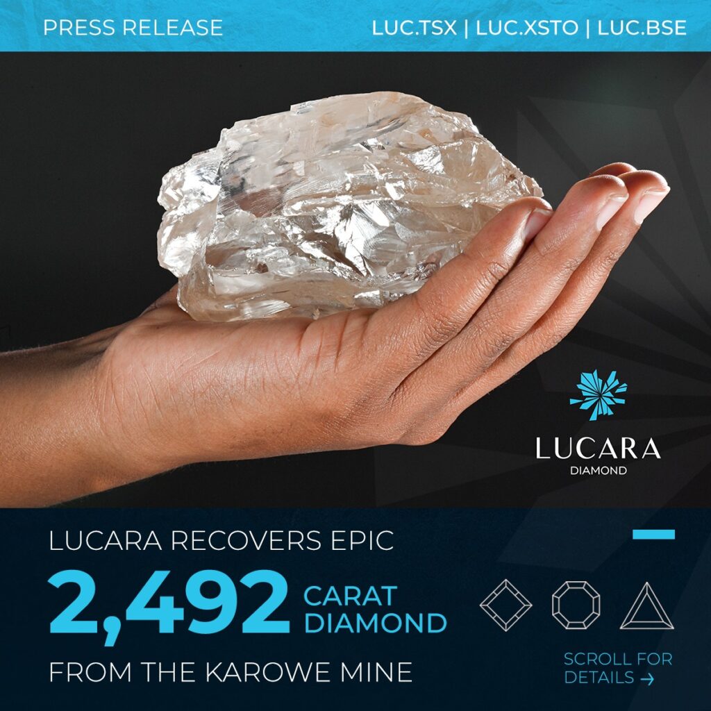 Вторият по големина диамант, намиран някога – необработен камък с тегло 2492 карата – е открит в Ботсвана в мина, управлявана от канадската фирма Lucara Diamond, предава „BBC“.