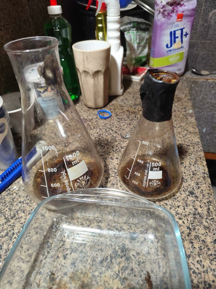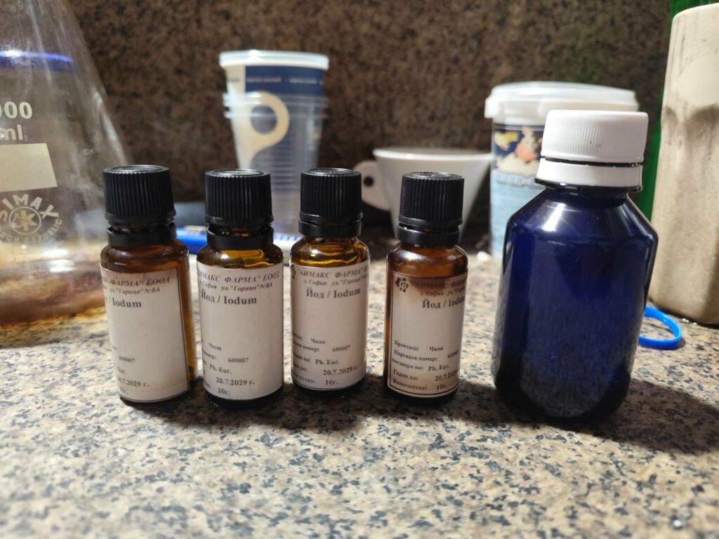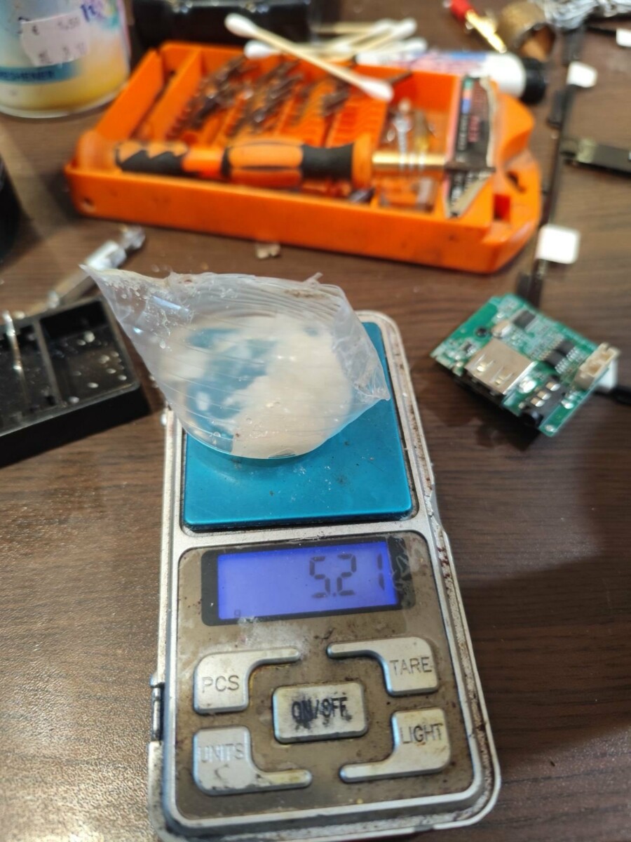 В имота са били намерени и иззети – прекурсори и съоръжения за производство на метамфетамин – две бутилки с вместимост от 1.5 л., съдържащи безцветна течност, реагирала при направения полеви наркотест на метамфетамин, както и чаша с бяло кристалообразно вещество /метамфетамин/ с тегло около 10 гр.