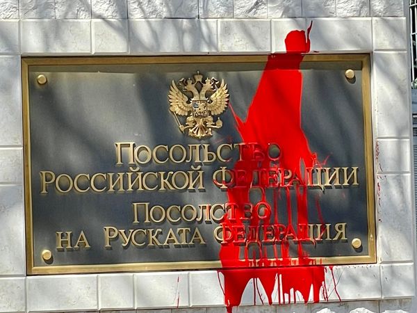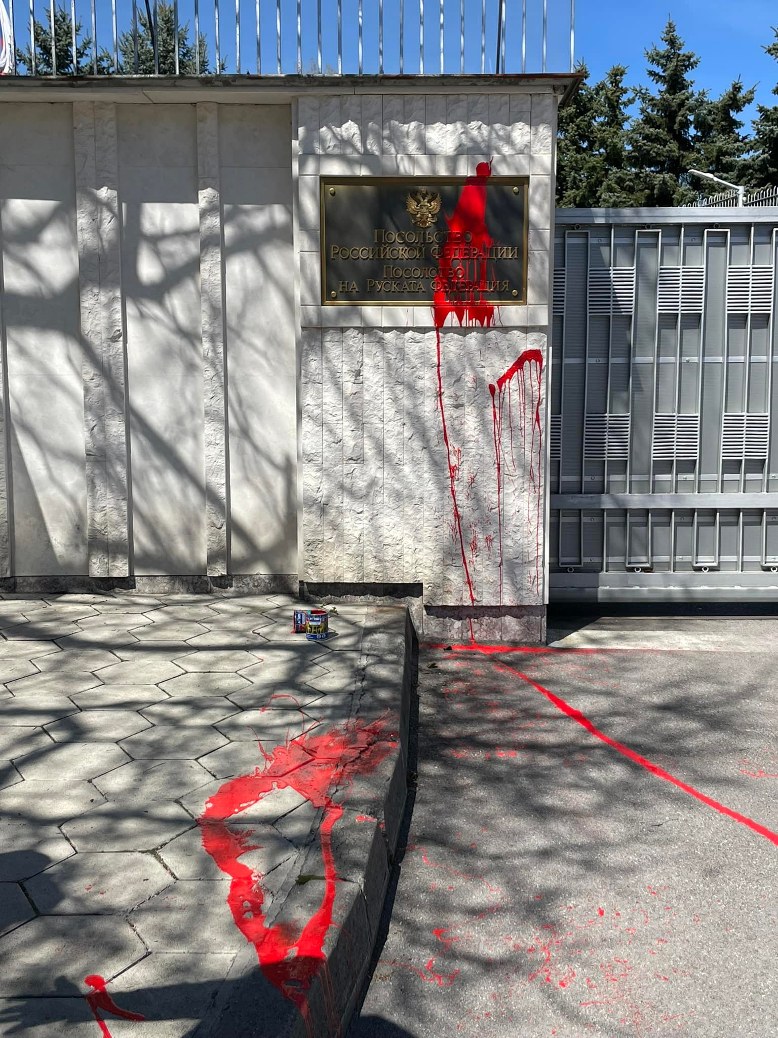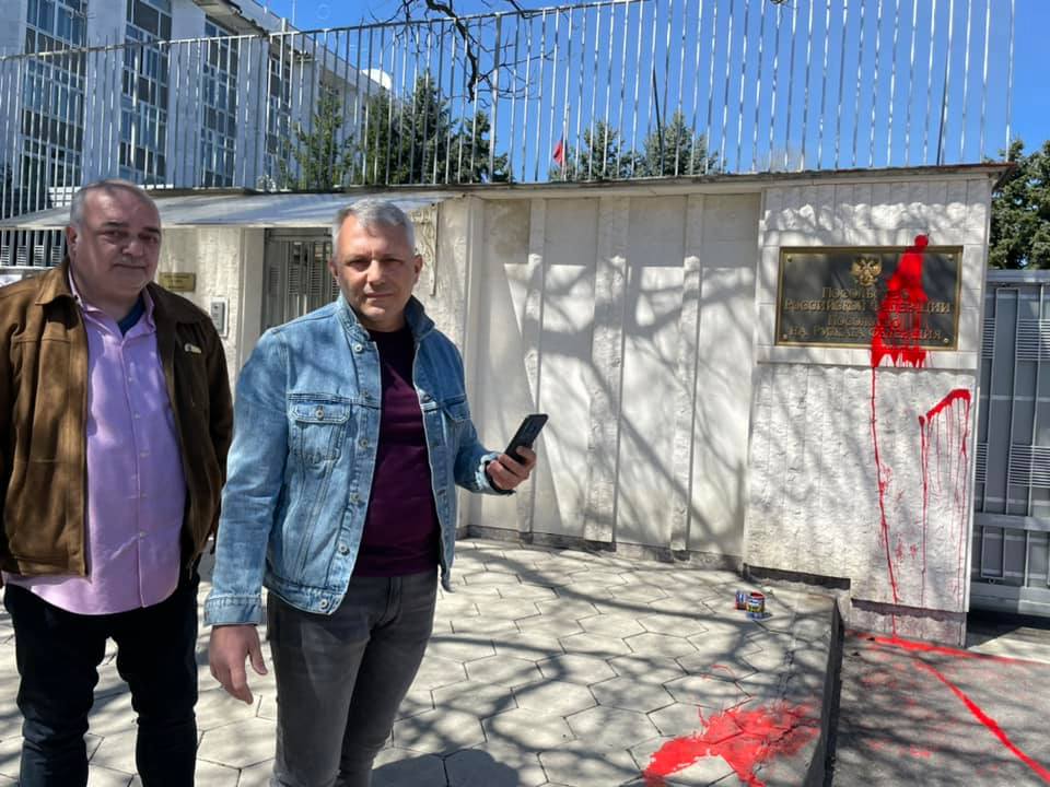 Полицейски служители са задържали адвокат Николай Хаджигенов и Арман Бабикян от „Отровното трио“. Малко преди това те са заляли табелата на посолството на Русия в столицата с червена боя. Следи от нея има и по тротоара пред дипломатическата мисия в квартал „Изгрев“.