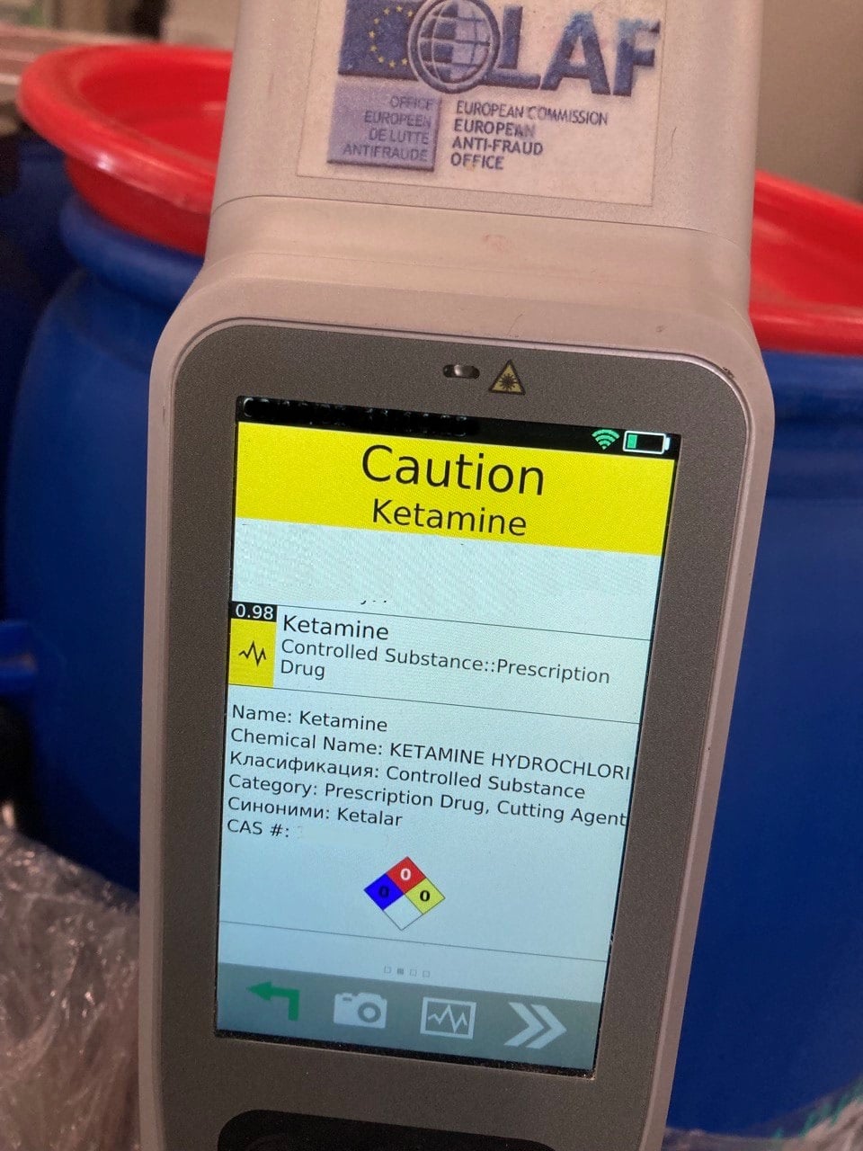 При отваряне на един от бидоните установили, че същият съдържа бяло прахообразно вещество. Извършен тест с раманов спектроскоп е дал положителен резултат за кетамин. Пратката е била спряна от митническите служители от направление и оставена за съхранение в склад под митнически контрол.