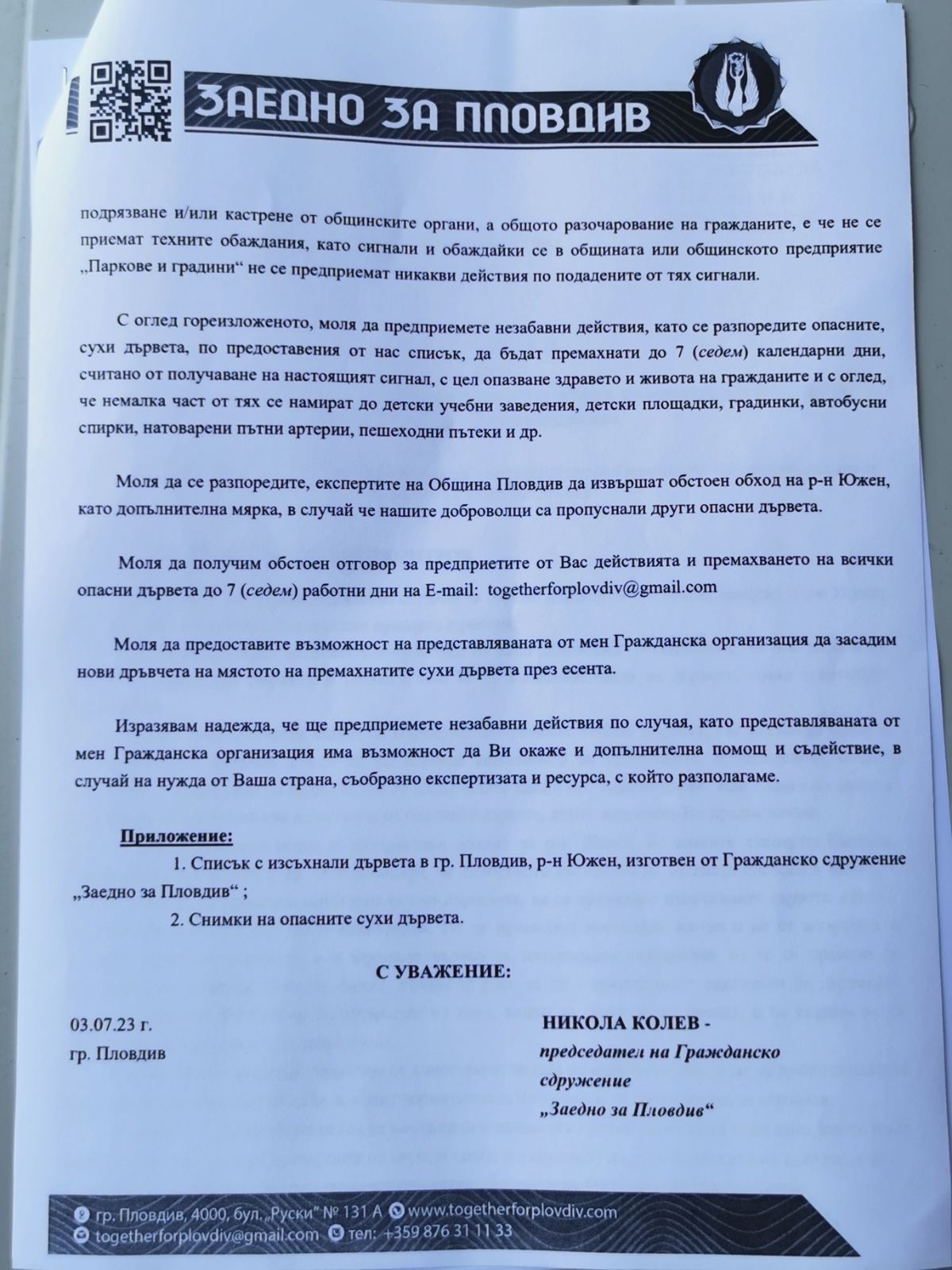 От гражданското сдружение настояват да се вземе сериозно под внимание изпратеното от тях писмото и Община Пловдив да поеме ангажимента за изпълнението му – отстраняване на изсъхналите и опасни дървета на територията на града. От „Заедно за Пловдив“ обещават на тяхно място да засадят нови фиданки за тяхна сметка.
