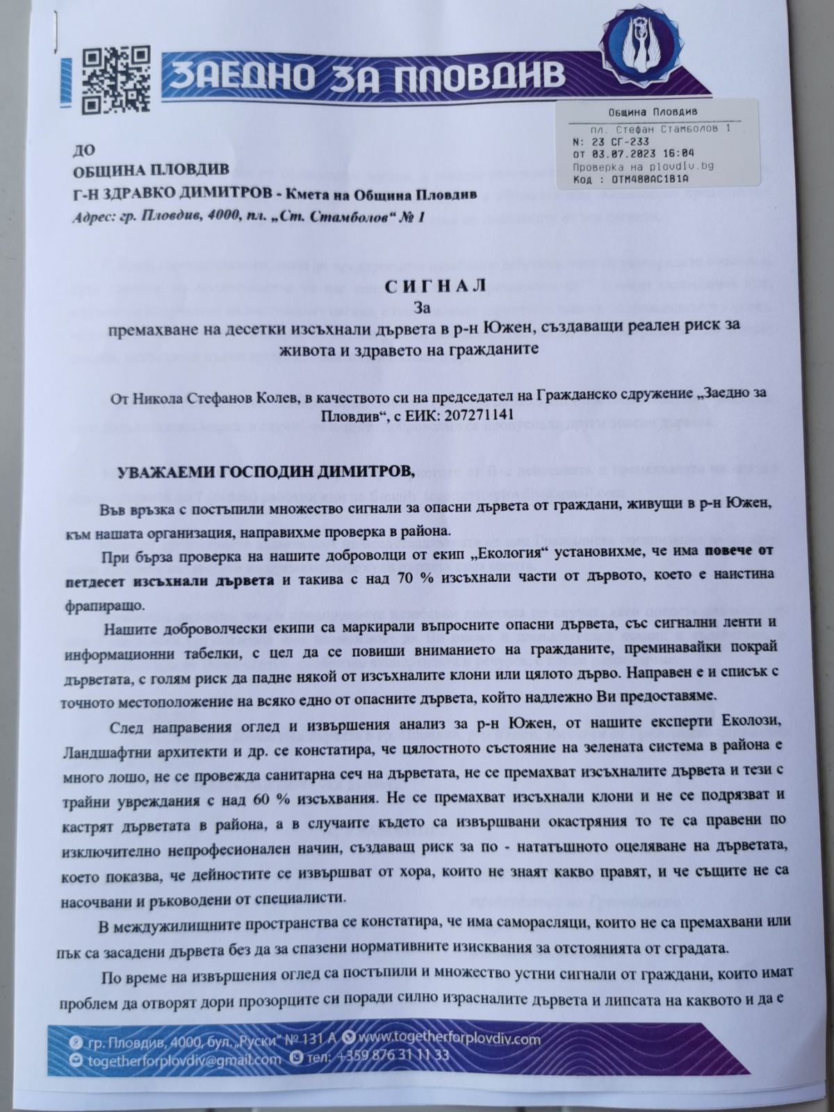 „Сигналът, който е подаден от „Заедно за Пловдив“, е регистриран в деловодството с входящ номер и съответно е препратен входящ номер към сдружението. По компетентност е изпратено до органите, които трябва да предприемат тези мерки – ОП „Градини и паркове“. Срокът за отговор на сигналите е 14 дни от датата на входирането му. Ще се обърне внимание на сигнала, който е подаден.“