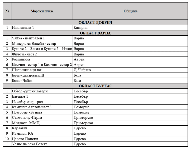Като бъдат съобразени обстоятелства като ход на висящи съдебни производства и възможните срокове на наемните договори, ще бъде извършена допълнителна преценка дали да бъдат открити процедури за отдаване под наем и на следните обекти – изключителна държавна собственост, обособени части от крайбрежната плажна ивица, представляващи морски плажове, находящи се в областите Варна и Бургас: