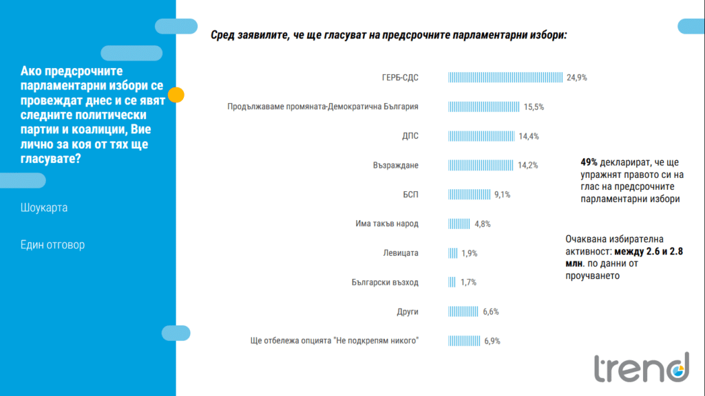 Въпреки наситения с политически събития месец, не се регистрира сериозна промяна в електоралните нагласи. Преговорите за ротацията и обвиненията около Агенция „Митници“ вероятно са причината за ерозия в подкрепата спрямо „Продължаваме промяната-Демократична България“ с малко над 2 процентни пункта от гласуващите. ГЕРБ-СДС задържа нивата си от последните месеци /24.9% от гласуващите/. ПП-ДБ /15.5%/, ДПС /14.4%/ и „Възраждане“ /14.2%/ са с близки стойности и представянето им в предстоящата предизборната кампания ще е ключова за крайната подредба на второто, третото и четвъртото място. Сигурна остава петата позиция за БСП /9.1% от гласуващите/, а на шесто място е „Има такъв народ“ с 4.8% от гласуващите. 6.9% от българите декларират, че ще се възползват от опцията „Не подкрепям никого“. 49% са тези, които заявяват, че ще гласуват на предстоящите предсрочни парламентарни избори, което се равнява на около 2.6 до 2.8 милиона избиратели.