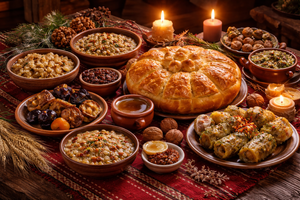 На трапезата традиционно присъстват ястия като варен боб, сарми с ориз, пълнени чушки, ошав, орехи, мед и обредна питка. Всяко от тях носи послание – за здраве, плодородие, благоденствие и единство на семейството.