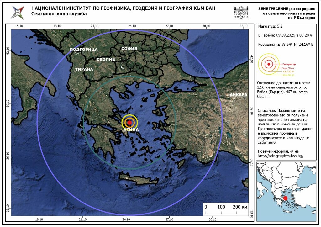 На 9 септември 2025 г., в 00:28 ч. българско време, бе регистрирано земетресение с магнитуд М=5.2 в района на остров Евбея, Гърция.