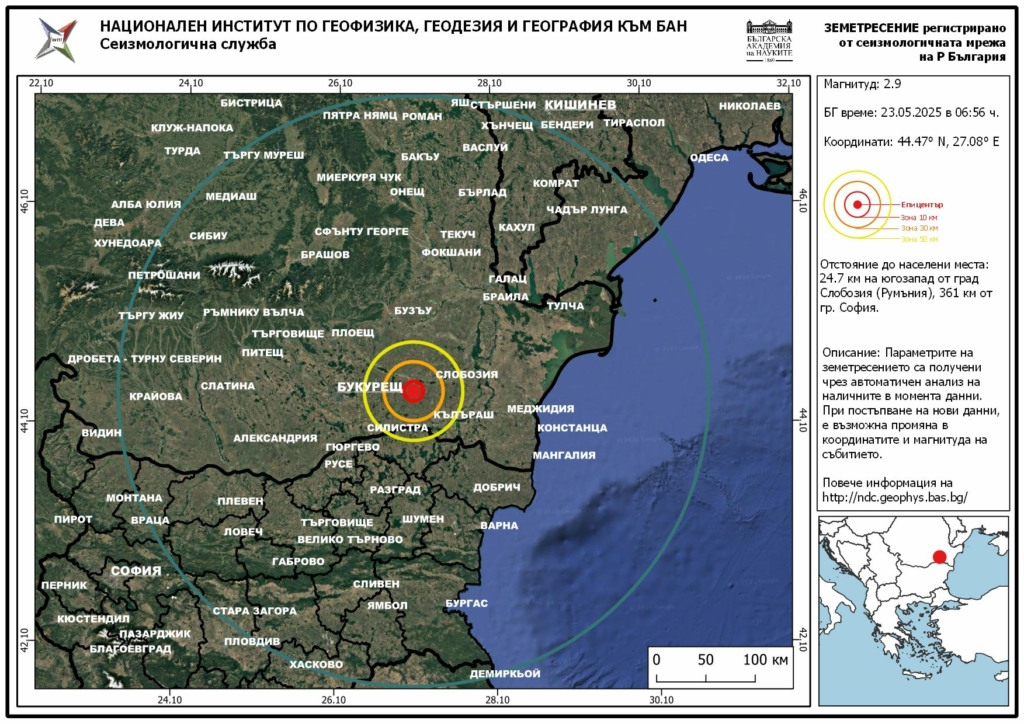 По данни на Националния Сеизмологичен Център към Национален Институт по Геофизика, Геодезия и География – БАН, събитието от 23 май 2025 г., от 06:56 часа българско време е с епицентър на 50 км от град Силистра, на 120 км от град Русе и на 360 км от град София.