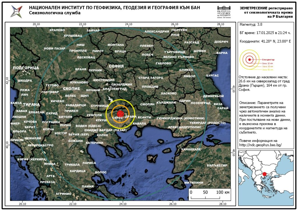 По данни на Националния сеизмологичен център към Национален Институт по геофизика, геодезия и география-БАН, събитието от 17 януари 2025 г., от 21:24 часа българско време е с епицентър на 25 км от град Гоце Делчев, на 30 км град Сандански и на 160 км от град София.